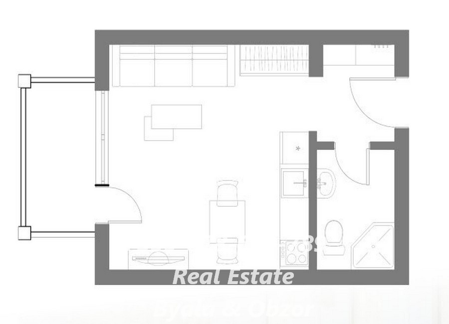 Прихожая, гостиная с зоной кухни, совмещенный санузел и балкон
